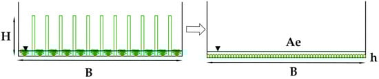 Assuming that the vegetation resistance was uniformly distributed over the bed, it was considered as particle resistance superimposed on the original bed to obtain an equivalent cross-section over water (Figure 4). In the figure, Ae is the post-equivalent cross-section over-water area, m2; H is the average height of the simulated grass cover, m; h is the average water depth of the cross section, m.
