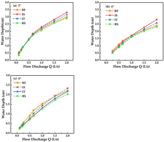 Plot of discharge versus water depth at different gradients in order of gradient 2° (a), 4° (b), and 6° (c).