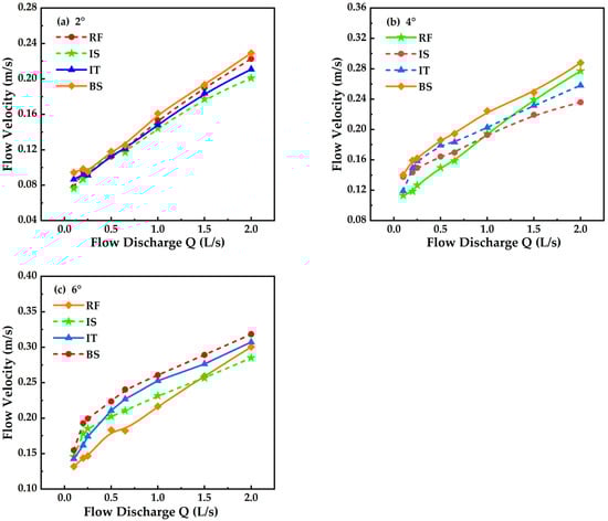 Plots of flow rate versus flow velocity for slopes of 2° (a), 4° (b), and 6° (c).