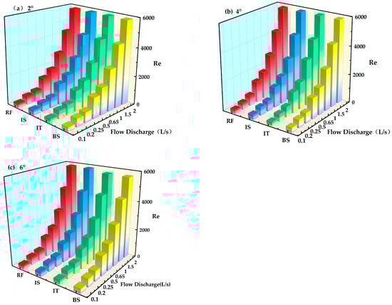 Flow versus Reynolds number, in order of slope 2° (a), 4° (b), and 6° (c).
