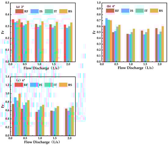 The Froude number, a key index for describing the flow pattern of water, reveals the relationship between the inertia of a water flow and its gravity. In open channel flow, the discrimination criterion states that when the Froude number (Fr) exceeds 1, the water flow exhibits rapid flow; when the Fr is less than 1, this indicates a slow flow; and when the Fr equals 1, the water flow reaches a critical state. Figure 8 shows that under the test flow rate, the slope flow presented as a slow flow state, and the Froude number was between 0.3 and 1.02. With the increase in flow rate, the slope Froude number exhibited a decreasing trend (R2 > 0.94), that is, the slope had a significant effect on the flow rate; the Froude number of the vegetated slopes was smaller than that of the bare slope, indicating that the presence of vegetation could effectively reduce the slope Froude number. As the slope increased, the Froude number increased significantly; the vegetated slopes increased the Froude number by about 50% compared with the BS, and the effect on the Froude number was significant between different vegetation combination methods, for which the Froude number of the RF combination method was higher than that of the IS and IT combination methods, indicating that the spread of the RF combination method had a weaker ability to block the runoff. To investigate the correlation between Froude number and vegetation combination techniques in greater depth, an analysis of variance (ANOVA) was performed to examine the Froude number across various vegetation combination methods. The findings illustrated a notable discrepancy (p < 0.05) in the Froude number among the different vegetation combinations, with the order of slope Froude number being RF > IS > IT. The reason for this difference could be that the vegetation distribution on the IS and IT slopes was more fragmented on the exposed slopes, whereas the exposed slopes were concentrated in the RF combination method, and the water flow through the unvegetated slopes had less resistance to flow and was more turbulent.
