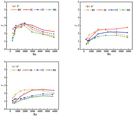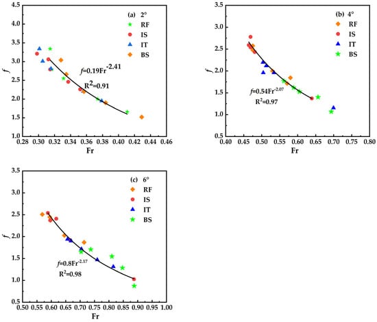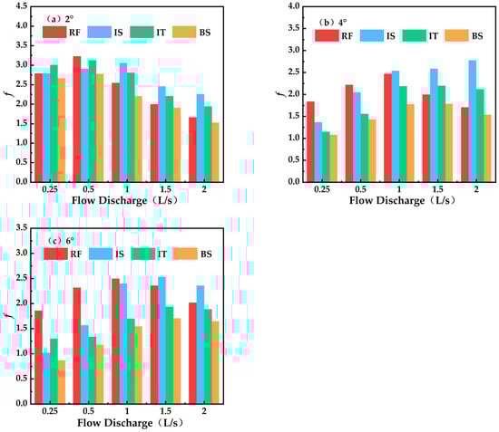 The drag coefficient, f, reflects the amount of resistance the subsurface provides to flowing water. Under the same flow and slope conditions, an increase in the value of f means an increase in the amount of energy used by the water flow to overcome the resistance, which, in turn, reduces the amount of energy used for erosion and sediment transport and ultimately reduces the degree of soil erosion. In this study, tests were conducted at slopes of 2°, 4°, and 6° to obtain resistance coefficients ranging from 1.1 to 3.34, 0.66 to 2.78, and 0.8 to 2.53, respectively. Figure 9 shows the relationship between drag coefficients and flow rates under different vegetation mix conditions. Under the condition of a 2° slope, the drag coefficients of the IS and IT combinations tended to increase with the increase in flow rate as the slope gradually increased, while the drag coefficient of the RF combination method tended to decrease after increasing to a certain value. Overall, the resistance coefficients of each vegetation combination increased with the flow rate as the slope increased (R2 > 0.93). In addition, the resistance coefficients were greater for the vegetated slopes compared to the BS, indicating that slope flow had to overcome greater resistance and expend more energy in the vegetated conditions. Notably, the IT combination had the smallest coefficient of resistance to slope flow, indicating relatively poor erosion resistance.