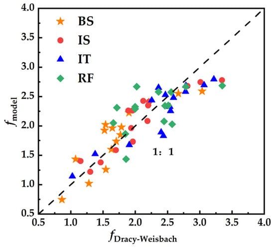 Comparison of the Darcy–Weisbach drag coefficients with those predicted using Equation (23).