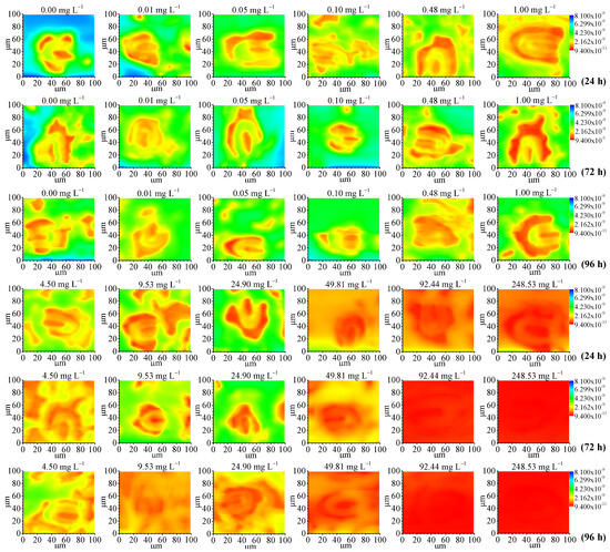 The area around the stoma was dominated by green and blue for the control and the samples treated with lower concentrations, then it gradually turned to green, yellow, and red as 2,4-DCP concentration increased up to nearly 100–250 mg L−1, indicating the oxygen concentration in the stoma decreased with increasing 2,4-DCP concentrations. There were clear three-tined-fork-shaped stoma for the control and the samples treated with up to about 50 mg L−1. However, when the concentration of 2,4-DCP continued to increase to 250 or 500 mg L−1, the outline of the three-tined-fork-shaped stoma became increasingly blurred. These results were in good agreement with the CLSM fluorescence images of the stroma (Figure 2). The stomatal oxygen release concentration gradually decreased with the exposure time, which is consistent with the variation rule (Figure 2).