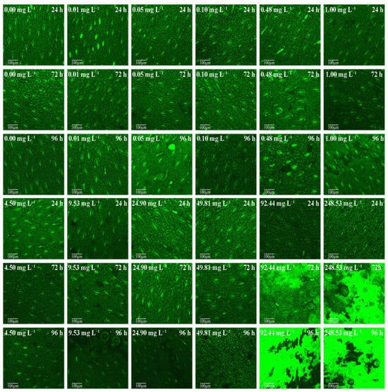 CLSM images of M. pteropus stoma under various concentrations of 2,4-DCP after different times (24 h, 72 h, and 96 h).