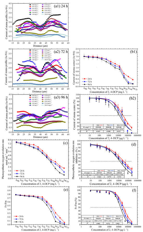 The current profile curves (a1–a3), the current curves of stoma center (b1), the photosynthetic oxygen evolution rate curves (c), the Fv/Fm curves (e), and their corresponding dose–effect curves (contain IC50 value) (b2,d,f) of M. pteropus stoma under various concentrations of 2,4-DCP for 24 h, 72 h, and 96 h. The error bars represent standard deviation Each treatment was replicated four times (n = 12).