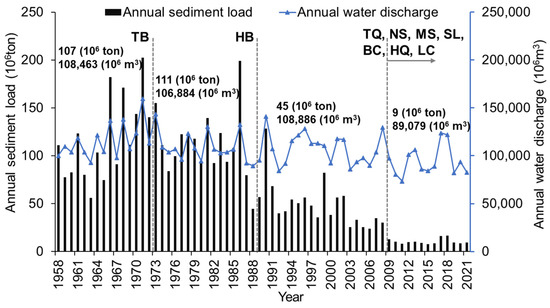 Inter-annual variation in sediment load and water discharge by the Red River system observed at the Son Tay hydrological gauging station in the period 1958–2021. Nine large dams have been built, and under their operations since the 1970s (dashed lines). The names of dams are referred to Figure 1 and Table A1.