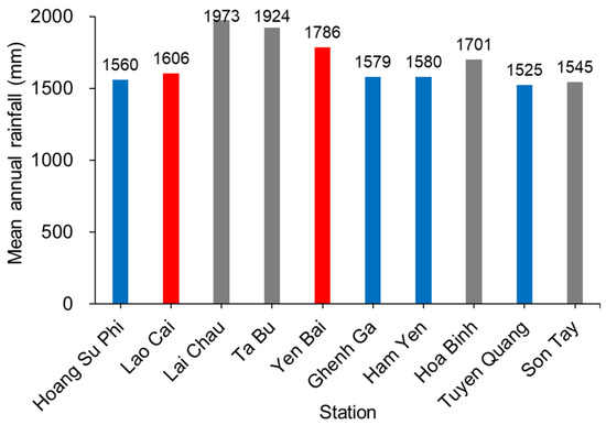 According to Figure 4, the mean annual precipitation varied among the stations, ranging from a low of 1525 mm for station Tuyen Quang (Lo River) to a high of 1973 mm for station Lai Chau (Da River), with an overall mean of 1593 mm. It is evident that the upper reaches of the Da River (Lai Chau and Ta Bu stations) received significantly higher precipitation compared to the others, which suggests that the Da River, one of the three main tributaries of the Red River, receives more rainfall and therefore contributes more to the water discharge than the other two tributaries, the Red River (main channel) and the Lo River (Figure 4). This observation is understandable considering the larger watershed area of the Da River (57,285 km2) compared to the Red (12,000 km2) and the Lo River (10,104 km2). This finding is consistent with the conclusion of Le et al. [14] and Nguyen et al. [11] that the Da River plays a major role in the river system, accounting for 53–57% of the total discharge.