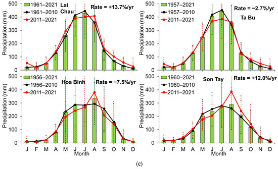 Rate of precipitation in the last four decades (~1960–2010) and the latest decade (2011–2021) at the ten climatic stations (see Figure 1). Panels (a–c) represent the Lo, main channel (Red), and Da Rivers, respectively. Error bars represent standard deviation (dashed lines).