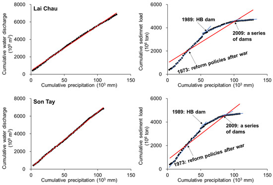 Before 1972, the cumulative precipitation and water discharge were well correlated, and a significant relationship was observed between cumulative precipitation and cumulative sediment load at both the Lai Chau and Son Tay stations. The right panel of Figure 6 shows four distinct temporal changes marked by abrupt points in 1973, 1989, and 2009, which were mainly caused by human activities. For example, economic reform policies (the Doi Moi reforms) were implemented soon after the Vietnam war in the northern country, leading to the significant changes since the 1973.