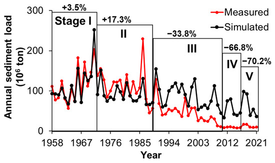To quantify the influence of climate change on water discharge and sediment load variations, as analyzed above, Stage I (1958–1971) was used as the benchmark period and considered a water-discharge-controlled Stage, also called the natural Stage. Therefore, human activity during the baseline period was assumed to be negligible. Following this assumption, the suspended sediment loads, simulated using the Stage I rating curves combined with measured river flows during Stages I–V, were compared with the observed ones (see Figure 7). The sediment load estimates in subsequent stages (II–V), therefore, were based on the sediment rating curve established during the initial period (Stage I). Any anomaly in the simulated sediment loads compared to those observed is primarily indicative of unnatural impact.