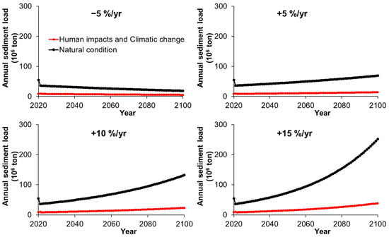 The fluvial sediment supply by the Red River system to the sea projected to 2100 under the combined effect of natural (including climate change) and anthropogenic sources (red dots) and under natural forcing only, including climate change (black circles). Four scenarios applied for the river flow with a decrease of −5% and an increase of +5, +10, and +15 per year.