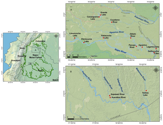 Sampling was conducted in the western Ecuadorian Amazon, within the Napo and Pastaza watersheds. Sampled water bodies within each watershed are shown in Figure 1. Both the Pastaza and the Aguarico have tributaries within the Peruvian Amazon, which, together with the rivers of the Amazon basin in northern Peru and southern Colombia, make up the Napo Moist Forest Ecoregion (Figure 1).