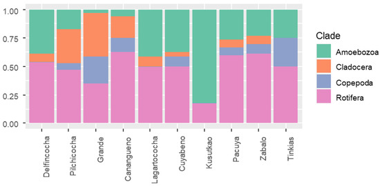 Overall, we found 107 zooplanktonic species, distributed as follows: 21 Cladocerans, 43 Rotifers, 15 Copepods, and 28 Ameboidae (Table S1, Supplementary File S1). Of these, 44 are new registers for the Ecuadorian Amazon and 36 for Ecuador (Table S1). Rotifers contributed the highest proportions of species richness across sampling sites, except for Grande Lake and Kusutkao River. Within Grande Lake, Copepoda and Cladocera contributed the highest proportions of species richness (Figure 2). In contrast, these clades were absent from Kusutkao, where Amoebozoa exhibited the highest proportions of zooplankton richness (Figure 2). We found that the distribution of species richness across clades was significantly different (Xi2 = 74.69, p ˂ 0.001) among water bodies.