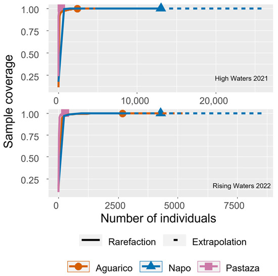 We initially estimated alpha diversity with q0, q1, and q2 Hill numbers, which represent species richness, and diversity of rare and of common species, respectively [12], for each sampled water body and for each season separately. Then, with the combined data of the main watersheds (Aguarico, Napo, and Pastaza), using the R programming language packages hillR [28] and iNEXT [29], for these main hydrological units, rarefaction curves were plotted to assess sample completeness [29] based on density (numbers of individuals by 100 mL water). Statistical comparisons of alpha diversities between watersheds were conducted through Kruskal–Wallis tests. Comparisons of zooplankton diversity were conducted using the integrated samples’ Hill numbers q0, q1, and q2, which were used to calculate alpha, beta, and gamma diversity indices for each sampled year, 2021 and 2022. The Hill number q0 is equivalent to species richness, while q1 and q2 are equivalent to the Shannon and Simpson diversities, of which the first gives more weight to rare species and the second to the most abundant species [30,31].