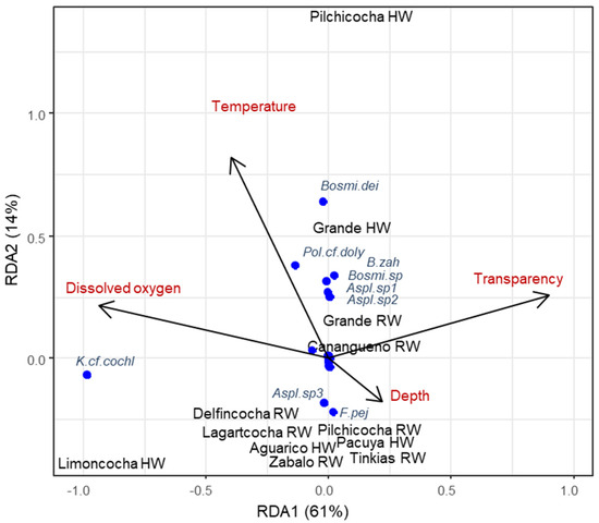 Based on the Pearson correlations (Supplementary File S3), we conducted the RDA with water temperature, dissolved oxygen, transparency, and depth as explanatory variables. The RDA indicated 0.75 constrained variance and 0.25 of unconstrained variance, and the model was significant (p = 0.049, F = 5.29, and 4 df). The first two constrained axes explained 61% and 14% of the variance, respectively. Water temperature had a significant effect (F = 3.22, p = 0.02), and dissolved oxygen had a marginally significant effect (F = 15.65, p = 0.06).