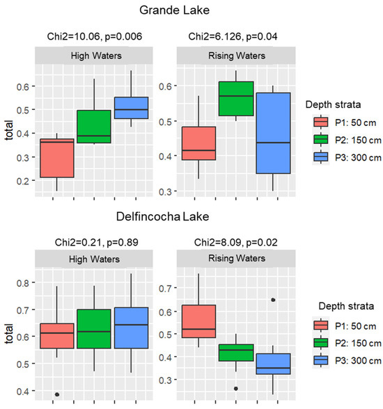 In Delfincocha Lake, the turnover index ranged from 0.38 to 0.83 during high waters and from 0.23 to 0.76 during rising waters. No significant differences in species turnover between depth strata were observed in high waters, but differences were observed in rising waters, when the turnover pattern was opposite to that of Grande Lake in high waters, as the index progressively decreased with depth (Figure 6).
