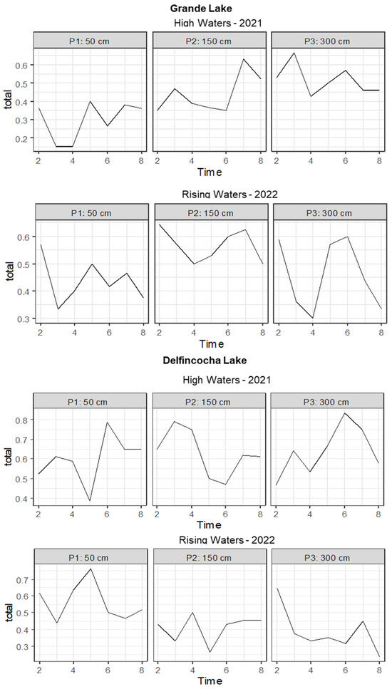 In Delfincocha Lake, drastic variations in the turnover index took place in the three depth strata during the abnormal high waters season (Figure 6), implying significant species replacements at different water depths within a 24 h period. However, these variations were more pronounced at 300 cm, where the turnover index ranged between 0.4 and over 0.6. This pattern persisted and became even more pronounced during rising waters. In contrast to Grande Lake, we did not find similar zooplankton species turnover patterns between seasons, indicating that variations in this lagoon are more stochastic.