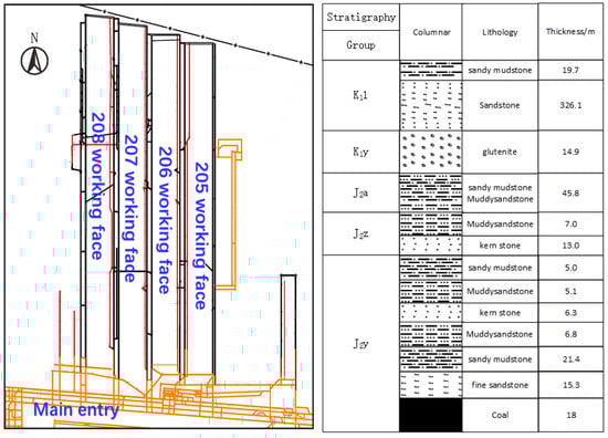 The coal seam mined in the Tinan coal mine is the 4th in the Jurassic Yan’an Formation. The dip angle of the coal seam ranges from 0 to 8 degrees, with a bottom boundary elevation of +380 m, an average thickness of 18.0 m, and an average mining thickness of 7.5 m. The 208 working face is located in the middle of the northern Erpan area of the mine, with the 205, 206, and 207 large goaf areas already mined out on the east side. The working face has a length of 3000 m and a width of 200 m. The comprehensive mechanized caving mining method is used, with natural caving management of the roof. According to existing geological exploration data, the geological structure of the 208 working face is simple, crossing the axis of the Nanyuzi anticline, with no significant faults, magmatic rocks, or collapsed columns found (Figure 1 and Figure 2).