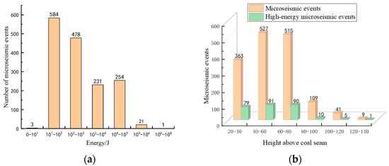 The monitoring period selected for the 208 working face is from 15 August 2022 to 25 January 2023, with an advancement distance of 500 m. The distribution of microseismic events is between elevations of +343 m and +488 m. Due to the small dip angle of the coal seam and nearly horizontal mining, layers above +400 m are defined as not containing coal seam roofs. The statistical distribution of roof microseismic events divided by the energy level is shown in Figure 4a. Considering the lack of unified standards for grading the magnitude of microseismic events, this study categorizes events with energy levels of 104 joules and above as high-energy microseismic events in this mine. Within the monitoring period, a total of 1572 roof microseismic events occurred, with 276 of them being classified as high-energy microseismic events.