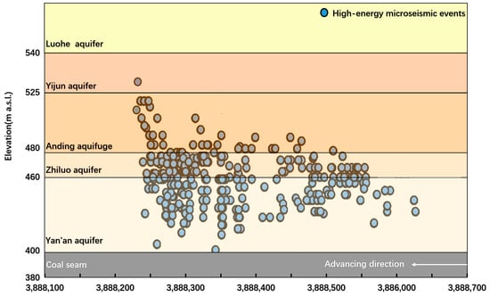 A vertical projection of high-energy microseismic events in the advancement process of the working face.