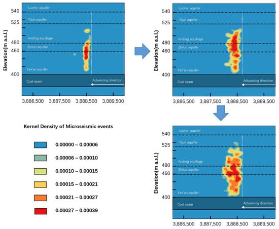 The microseismic event density represents the degree of rock mass damage. Based on the spatial locations of high-energy microseismic events during the advancement of the working face, the distribution map of high-energy microseismic events (Figure 5) and the kernel density map (Figure 6) on the longitudinal profile of the 208 working face were plotted. Figure 5 shows that high-energy microseismic events are mainly concentrated vertically within the range of approximately 80 m above the coal seam in the Yan’an Formation and Zhiluo Formation, consisting of fine sandstone and coarse sandstone. The highest concentration can reach around 130 m above the coal seam. Above the Zhiluo Formation aquifer, there is a thick mudstone aquitard at a distance of 60 m, which acts as a barrier and absorbs stress and energy propagation to some extent. Therefore, the number of microseismic and high-energy microseismic events detected above the mudstone layer are relatively low.