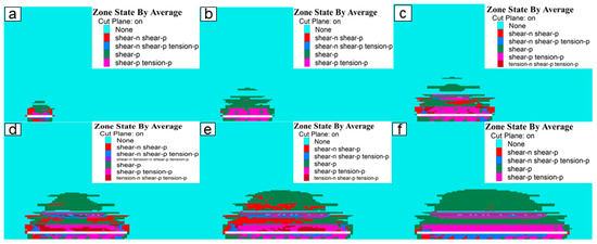 Plastic deformation zone diagram during model excavation. (a) 100 m state (b) 200 m state (c) 300 m state (d) 400 m state (e) 500 m state (f) 600 m state.