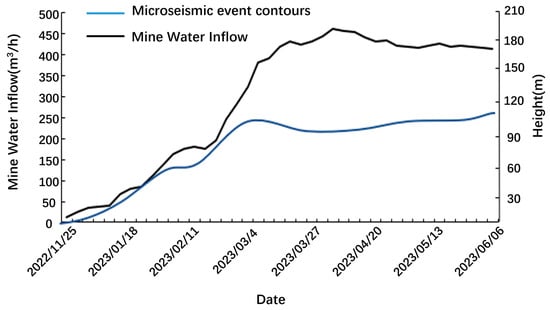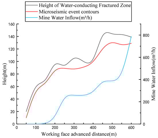 As the mining of the working face progresses, the excavation area continuously expands, leading to an increase in the height of rock-fracturing movements. The sinking of the strata in the Luohexia Formation and the enlargement of the fracture range resulted in a gradual increase in water inflow in the 208 working face. Subsequently, an analysis was conducted on the correlation between the water inflow of the 208 working face during the mining process and the microseismic monitoring data.