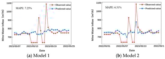 The results shown in Figure 10 illustrate that the data-driven MLP models, due to their deep network structure, exhibit strong learning capabilities. In predicting water inflow, they can capture deep-level features, thereby predicting the overall trend of water inflow. Specifically, the average absolute percentage errors (MAPE) of both models are less than 10%, indicating a high degree of fitting and reliable prediction trends. Model 2 has smaller errors than model 1, indicating higher prediction accuracy. Moreover, compared to model 1, model 2 demonstrates superior performance in predicting the inflection points of water inflow, accurately predicting the timing of extreme values. This suggests that using lagged microseismic data for prediction can significantly improve the accuracy of water inflow prediction.