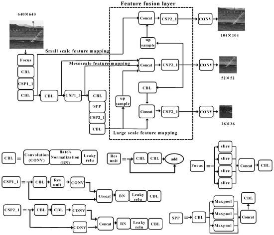 In summary, the water level line anchor frame size was set as a medium-sized target (labelled so that the water level line passes exactly through the midpoint of the anchor frame), corresponding to the mesoscale feature mapping, and the following improvements were made to the feature fusion network layer in the neck of the YOLOv5 network: two transfer nodes of the YOLOv5 small-scale feature mapping and the large-scale feature mapping were pooled into the mesoscale feature mapping channel, and the mesoscale feature mapping was performed in a tight manner, fully fused, and reduced the convolution and pooling operations before the original small-scale and large-scale feature mapping fusion to improve the ability of mesoscale feature mapping to convey spatial information and detailed information. The improved YOLOv5 network structure is shown in Figure 3.
