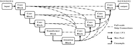 In the full-scale connectivity structure, the feature maps of each scale in the encoder were fused into the decoder so that the deep structure of the network incorporated more shallow information. Therefore, this enables the features of different depths in the encoder feature maps to be retained more efficiently.