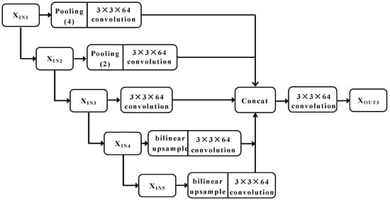 where denotes the multi-scale fusion operation by convolution and splicing; is the convolution; is the up-sampling operation; and is the down-sampling operation.