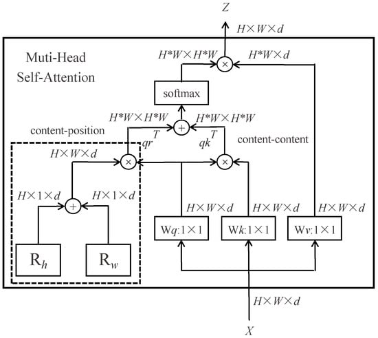 where denotes the -th attentional endpoint; , , , are the input feature maps; , , are the convolutional layer weights; is the positional coding matrix; , , are the positional feature vectors that can be trained to acquire vertical and horizontal information; and is the activation function. The formula is shown below: