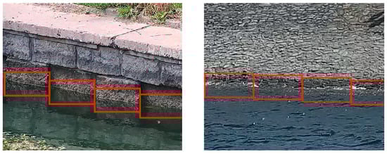 - The YOLOv5 algorithm [15], which has excellent accuracy and real-time performance, was used for the target detection of the water level line (i.e., waterfront demarcation line), and the centre point of the captured water level line’s anchor frame was linearly fitted to obtain a water level line that approximated the real one. In this way, according to the law of large numbers, it is not required that the detected anchor frames cover the entire area of the water level line but only that the results are statistically correct. Evidently, this greatly enhances the robustness of the present technique.