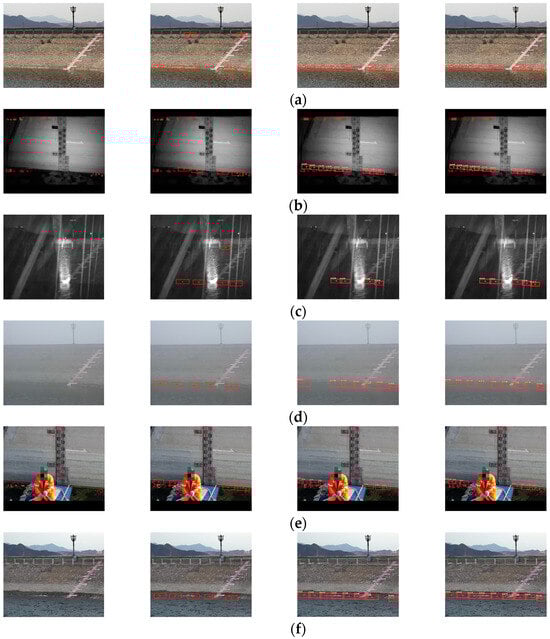 As can be seen in Figure 13, the real water level lines all pass through the centre of the predicted anchor frames; the method in this study outputs more anchor frames, and more anchor frames imply higher fitting accuracy. It can be seen that the method in this study is more capable of recognizing the water level line in complex and harsh environments with a higher generalization performance. The ablation experimental data in Table 3 also support the above conclusion: the slope accuracy of the method in this study is 97.3%, which is 2.4% higher than the original algorithm; the intercept accuracy is 99.3%, which is 0.5% higher than the original algorithm.