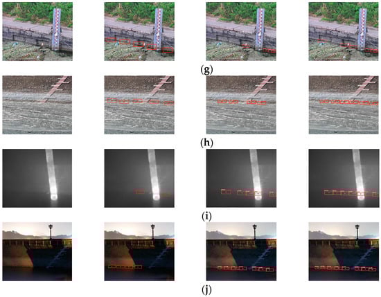 In water level monitoring, as shown in Figure 1, these complex and harsh environments, such as those with low light at night, rain, haze, snow, shadows, the Tyndall effect, and obscuration by floating objects, are very unfavourable to the characterisation of a target, which results in existing water level detection algorithms being unable to accurately locate the water stage gage or the surface of the water. In addition, they are susceptible to omissions and misdetections in some parts of the image, seriously affecting their performance.