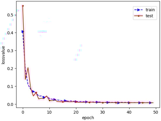 Fifty rounds of training were performed based on the above loss function and the change in model loss values was recorded (see Figure 15, lossvalue is a parameter value in model training, the lower the value is, the better the model training effect is; epoch is the number of iterations in model training).