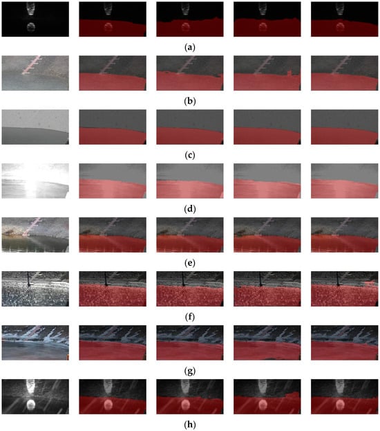 Comparison of prediction effects of different network models. (a) Low light level. (b) Haze. (c) Snow. (d) Tyndall effect. (e) Camera shake. (f) Wavy. (g) Water surface freezing. (h) Rain. (The original image, TRCAM-Unet, Deeplab, PSPNet, and Unet are arranged from left to right).