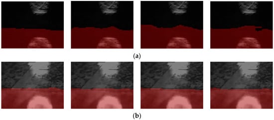 The experimental results are shown in Table 6. It can be seen that the experimental groups achieved some improvements on the basis of Unet’s semantic segmentation model. Compared with the first experiment, the second experiment replaced all the convolutional layers of the original encoder’s single scale with the Transformer structure, and the second experiment improved the detection accuracy with the Transformer structure. The parameters were reduced dramatically, which effectively improved the correlation between the local features. Compared to the first experiment, the third experiment added a residual channel attention module between the encoder and the decoder, thus improving the network accuracy without changing any parameters. The fourth experiment combined the two improvement methods of Experiment 3 and Experiment 2, and the result was that both Experiment 3 and Experiment 2 provided better results than the single improvement method. Under the assumptions of the fifth experiment, which replaced the basic jump structure with a full-scale connectivity structure, a significant reduction in the number of parameters was achieved and the detection accuracy of the model was improved. In conclusion, these improvements can enhance the performance of net detection. The test set had a total of 600 water surface images, covering a variety of different harsh environments. Due to the space limitation of the layout, eight images with typical significance were selected for presentation. In Figure 16, from left to right, the detection maps of the original image, the method used in this study, Deeplab, PSPNet, and Unet are shown, respectively. The effect image after segmentation is enlarged for the convenience of presentation, the plane area after segmentation is marked in red, and in the bottom surface, the dike is marked in black. The low illumination and rainfall-obscured water level areas in Figure 16a,h were enlarged and are shown in Figure 17. It can be seen from Figure 16 and Figure 17 that the surface edges obtained by segmentation under various complex and harsh environments are closer to the actual surface edges, as suggested in this study for the TRCAM-Unet model, whereas the other network models tend to produce segmentation edges that are unstable and false areas of recognition. The experimental results show that this method can achieve more high-precision water level detection.