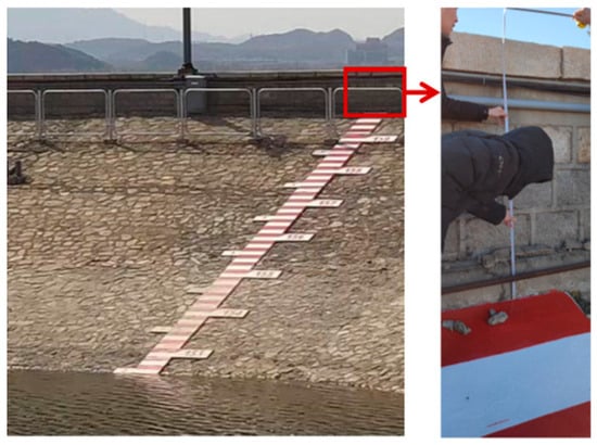 - First, the ratio of the true distance to the Pixel lengths was obtained using the obvious and fixed markers in the water level image, as shown in Equation (9).