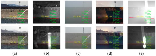 Detection results of water level without water gauge in complex and harsh environment. (a) Wavy, (b) rain, (c) fog, (d) shadow, and (e) Tyndall effect.