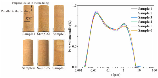 In this study, six sandstones were selected, each exhibiting bedding planes perpendicular to the axis of the cylindrical core. The sample dimensions were 50 mm (diameter) × 120 mm (height) (Figure 1). The P-wave velocity and porosity of each sample are presented in Table 1. Additionally, the pore size distribution curve was determined by testing the NMR T2 spectra of the sample (Figure 1). Na2SO4 solutions with concentrations ranging from 0 g/L to 10.00 g/L were prepared for capillary water imbibition tests.