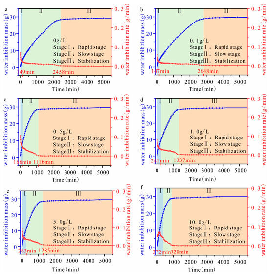 The variation in the water imbibition mass and water absorption rate with different concentrations ((a) sample with a solution concentration of 0.00 g/L; (b) sample with a solution concentration of 0.10 g/L; (c) sample with solution concentration of 0.50 g/L; (d) sample with solution concentration of 1.00 g/L; (e) sample with a solution concentration of 5.00 g/L; (f) sample with a solution concentration of 10.00 g/L; the bule line refers to the water imbibition mass; the red line refers to the rate of water imbibition).