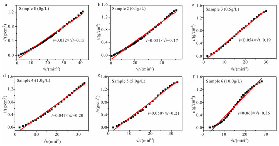 The sample’s sorptivity consistently increases with the solution concentration (Figure 4). The sorptivity of sample 3, at a concentration of 0.5 g/L, only slightly declines compared to that of sample 6, which has the highest solution concentration.