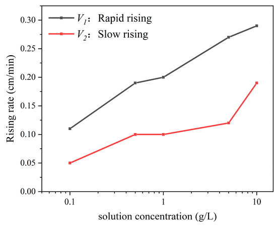 The impact of the solution concentration on the variation in the water imbibition front height is clearly demonstrated in Figure 5. In general, except for samples with a concentration of 0.50 g/L, the duration for the water imbibition front height to reach its maximum gradually decreases as the solution concentration increases. The height of the capillary imbibition front of the sample initially exhibits a rapid rise, followed by a decrease in the rate of rise until it eventually reaches the top of the sample. Therefore, the variation in the height of the capillary imbibition front over time can be categorized into three distinct stages: rapid rise (V1), slow rise (V2), and stabilization (V3). We can define the variation in the height of the imbibition front with time as the water imbibition front rise rate. The slope of the fitted front height versus the time curve is calculated as the front rise rate at a certain stage. The results of the front rise rate for the fast-rise and slow-rise stages are shown in Figure 6.