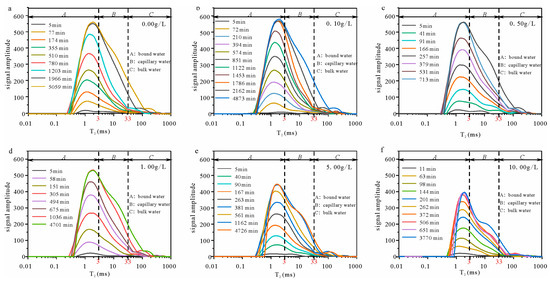T2 spectra with various solution concentrations ((a) sample with a solution concentration of 0.00 g/L; (b) sample with a solution concentration of 0.10 g/L; (c) sample with a solution concentration of 0.50 g/L; (d) sample with a solution concentration of 1.00 g/L; (e) sample with a solution concentration of 5.00 g/L; and (f) sample with a solution concentration of 10.00 g/L).