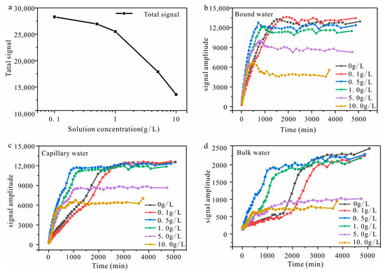 The total signal with various solution concentrations and three types of pore water signal amplitudes ((a) the total signal of the T2 spectra; (b) the signal amplitude of bound water with the imbibition time; (c) the signal amplitude of capillary water with the imbibition time; (d) the signal amplitude of bulk water with the imbibition time).