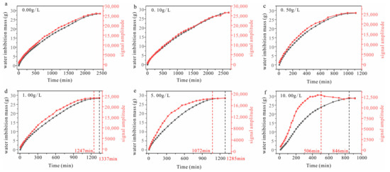 NMR signal amplitude and water imbibition mass of samples with various solution concentrations over time (the black line refers to the water imbibition mass; the red line refers to the T2 signal amplitude).