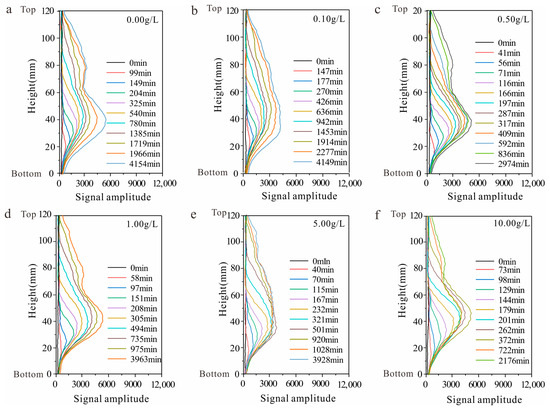 Stratified moisture distribution curve with various solution concentrations ((a) sample with a solution concentration of 0.00 g/L; (b) sample with a solution concentration of 0.10 g/L; (c) sample with a solution concentration of 0.50 g/L; (d) sample with a solution concentration of 1.00 g/L; (e) sample with a solution concentration of 5.00 g/L; and (f) sample with a solution concentration of 10.00 g/L).