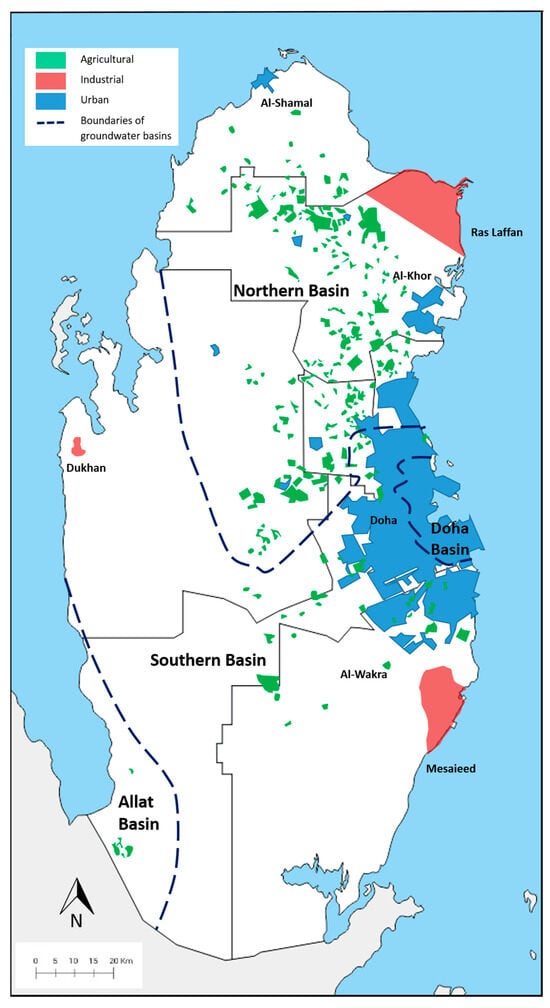 Map of Qatar showing the agricultural lands, urban areas, major industrial cities, and boundaries of groundwater basins adapted from [32,33,34] and google maps.